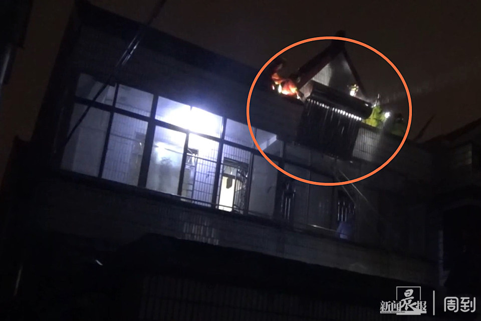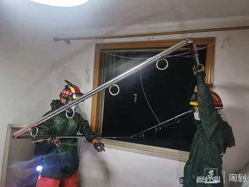在征得居民同意后,消防救援人员把外窗拆除后,用绳索将脱落的晾衣架拉进室内,用了约20分钟排除险情。