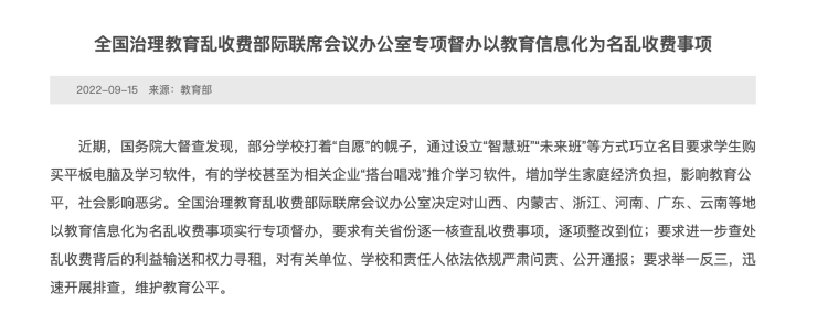 全国治理教育乱收费部际联席会议办公室同时要求,其他各省要吸取教训,加强数字化教育资源进校园审核监管;要严禁以信息化教学或分班教学为名强制或变相强制学生购买平板电脑或教育APP;作为教学、管理工具要求统一使用的平板电脑或教育APP,学校不得作为服务性收费和代收费项目向学生及家长收取任何费用,不得以家委会或直接支付企业等方式变相强制学生购买;要对教育乱收费现象“零容忍”,切实保持治理教育乱收费的高压态势。