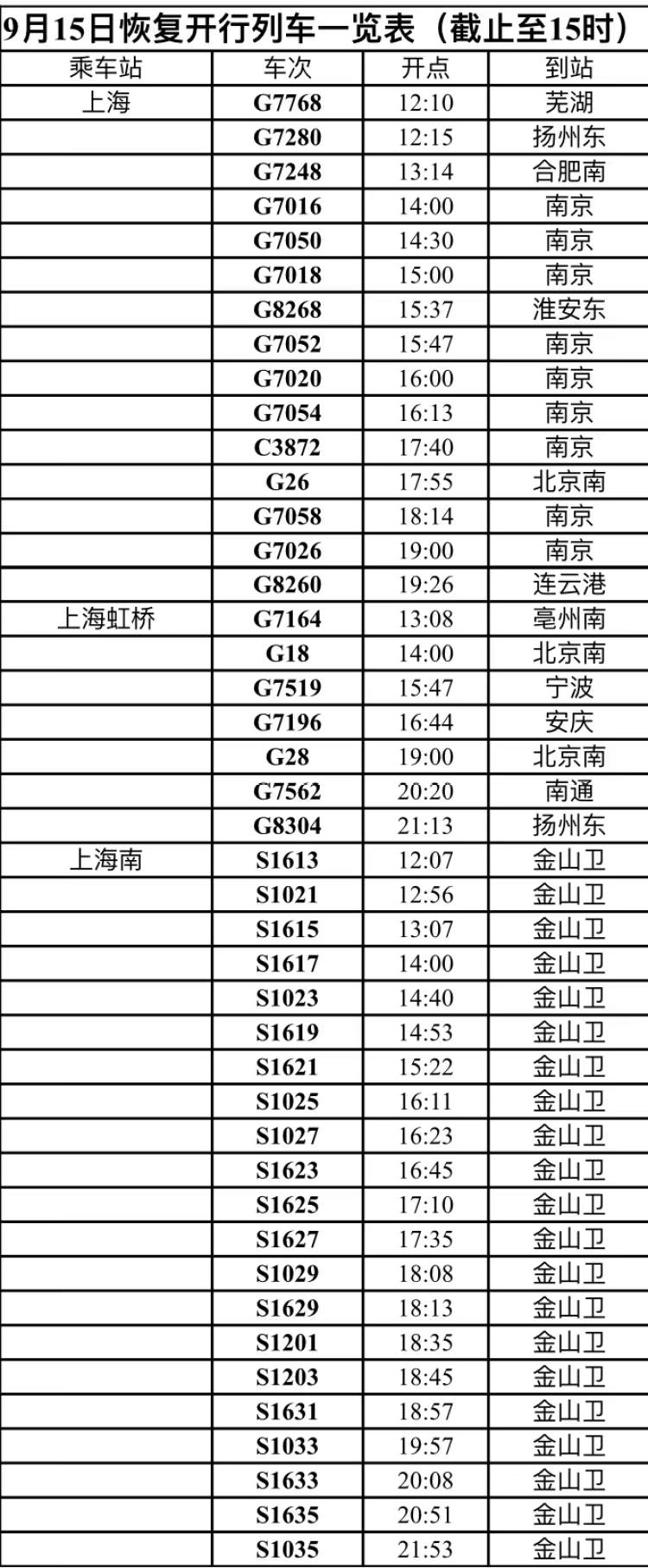 恢复开行列车车次及运行时刻等相关信息,请以车站公告为准,或通过铁路12306客服热线、官方网站、APP等渠道查询。旅客还可关注铁路12306客服网站公告,以及铁路上海站官方微博、微信信息,以便合理安排行程。