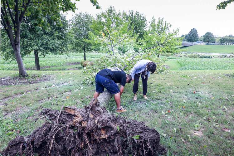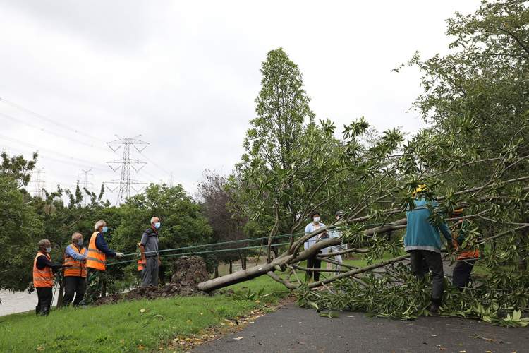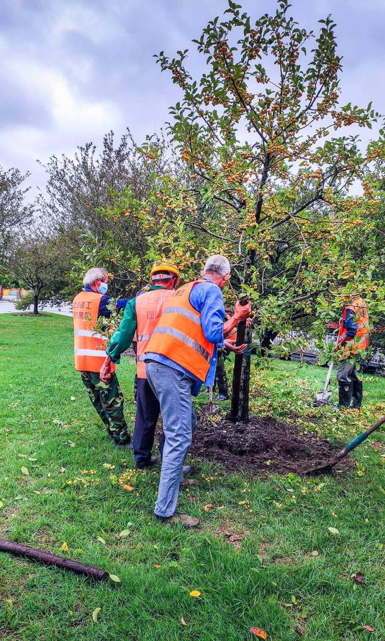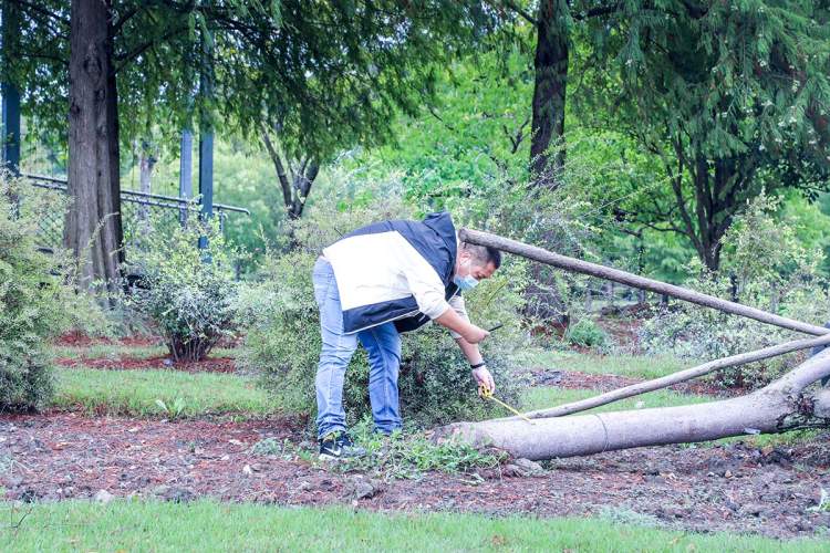 台风已过,目前各公园还在清理台风留下的“战场”,为植物“疗伤”。比如在辰山植物园,园艺师和养护人员今天一早利用阵雨间隙,首先对较珍贵、重要的植物进行疏枝、扶正、打桩处理,目前树状月季、樱花、海棠、槭树、玉兰、七叶树等植物均已扶正。随着风力和雨势减弱,再整合人手,集中扶正倒伏树木。在倒伏树木处理过程中,养护人员首先对扶正树木进行树冠和受损根系的修剪,以减少后期水份的蒸腾,防止根系腐烂;在倒伏树木扶正后及时做好支撑,防止树干再次倾倒;后期还将根据植物恢复状况,及时使用生根剂、抗蒸腾剂等措施,并做好病虫害防治,确保植物成活率。