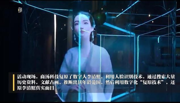 现场,商汤科技复原了数字人李清照,利用人脸识别技术,通过搜索大量历史资料,文献古画,推断出其年龄范围,然后利用数字化“复原技术”,还原李清照真实面貌。