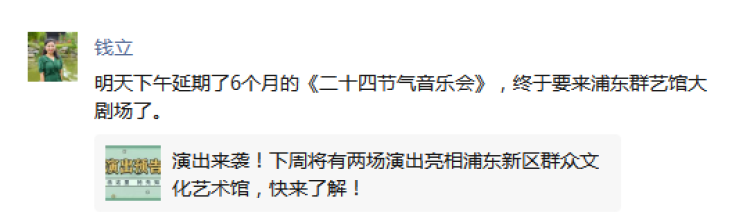 上海古凡交响乐团团长钱立在朋友圈发文,祝贺演出恢复