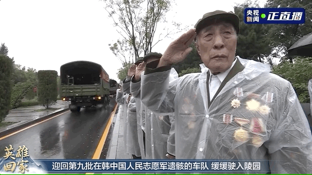 现场的志愿军老战士在雨中敬礼