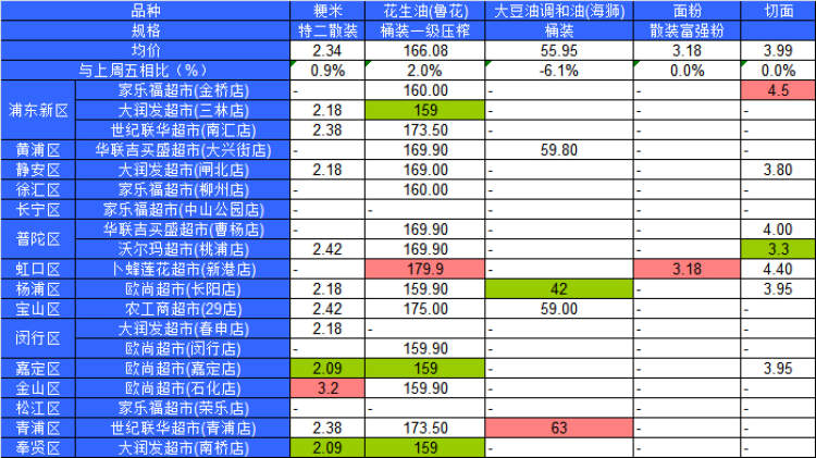 ■粉底标注代表该粮油品种在上述超市的最高价;绿底标注代表该粮油品种在上述超市的最低价