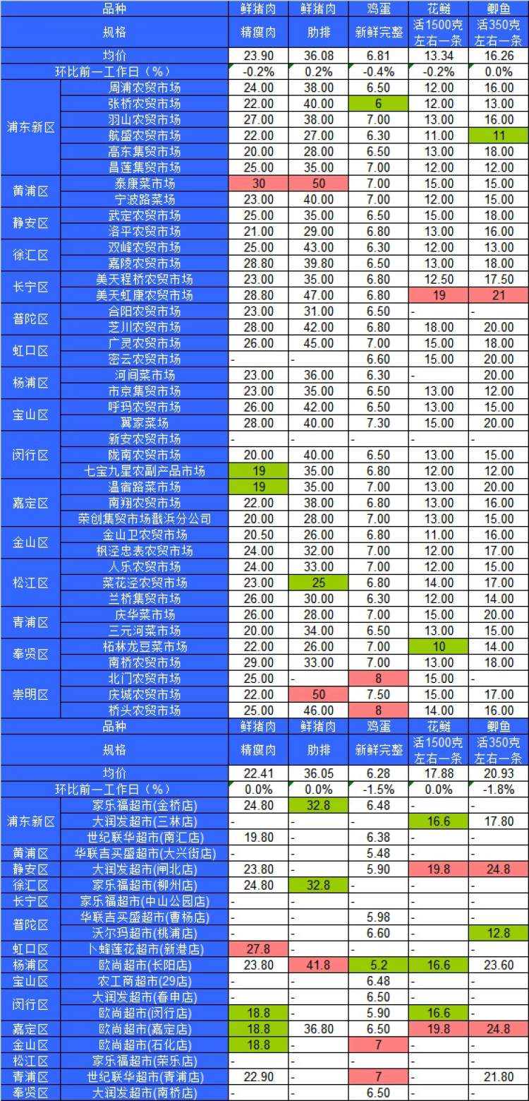 ■粉底标注代表该肉蛋鱼品种在上述农贸市场或超市的最高价;绿底标注代表该肉蛋鱼品种在上述农贸市场或超市的最低价