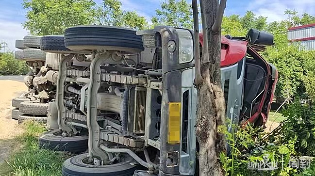 ▲大货车撞树后侧翻在路边