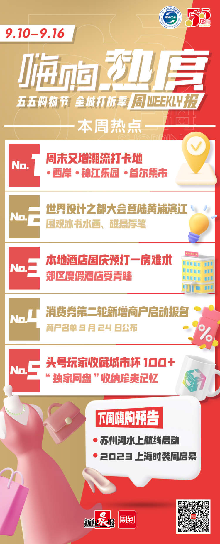 第三届“五五购物节”正在进行时,新闻晨报·周到推出的“嗨购热度周报”,为你盘点9月10日至9月16日这一周的热门“打卡”瞬间,再划一划下周的“嗨购”重点。