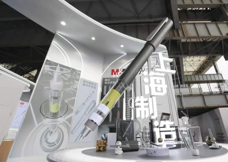 色彩斑斓的画面“遇水显形”,冷却一下就能看到画面的“冰书”;功能百变的智慧车站,雨伞、口罩等一应俱全;两米多高的中性笔装置,现场感受“磁悬浮”书写体验;老凤祥足金胸针用上了3D打印,重量从20克降至7克……