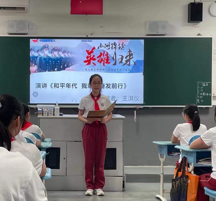 王淇仪有感而发:“此时此刻,第九批在韩志愿军遗骸已经安然抵达沈阳。我们初二四班的师生共同缅怀他们,同时也缅怀母校的志愿军烈士校友胡聿章,他牺牲时年仅十九岁。我们不仅要学习先烈的事迹,更要激发努力学习的内驱力,立报国之志,展青春风采。”