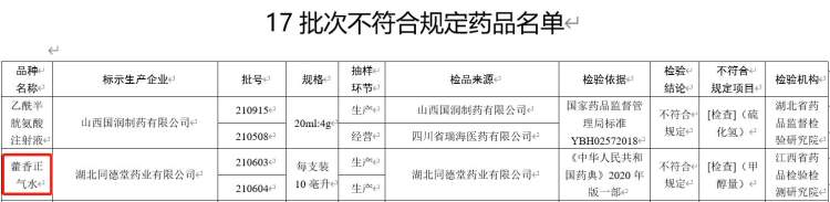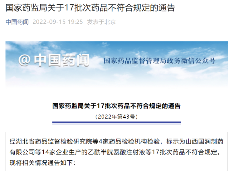 国家药监局官微“中国药闻”昨日发布关于17批次药品不符合规定的通告,经湖北省药品监督检验研究院等4家药品检验机构检验,标示为山西国润制药有限公司等14家企业生产的乙酰半胱氨酸注射液等17批次药品不符合规定。