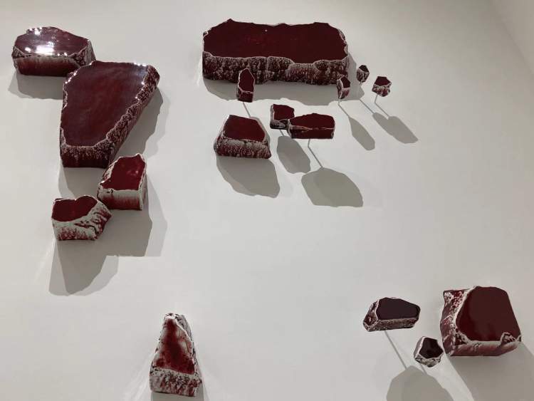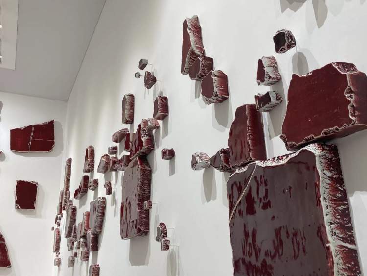作品《痕迹之形》是一块块大小不一的郎红釉瓷块,艺术家以长达十年之久的材质探索,寻找在成色、成形方面均不稳定的郎红釉所能够达到的纯洁与稳定状态。作品灵感来自刘建华在世界各地博物馆考察期间的印象和想象。《痕迹之形》以陶瓷与釉色自身的特质穿流历史,传达人类文明进程中的诸多发展痕迹及其意义。
