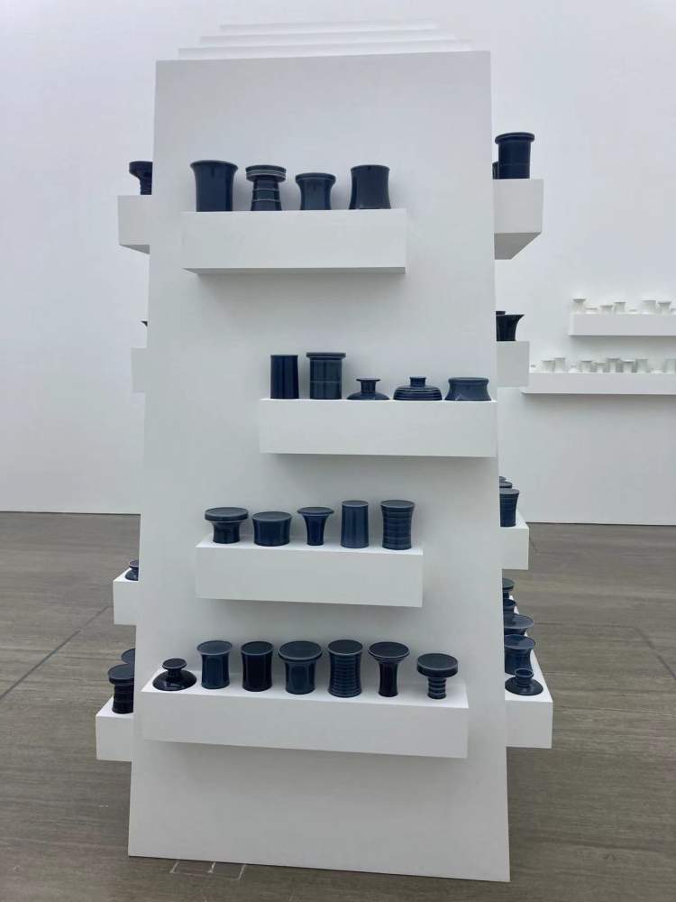 作品《塔器》在塔型的展柜上摆放了一系列瓷瓶的颈部,将传统陶瓷器物的形态进行了抽离,而柜面上铺撒的白沙象征着中国陶瓷走向世界的历史进程,塔型展柜类似于装满瓷器的集装箱,也带有某种精神象征。