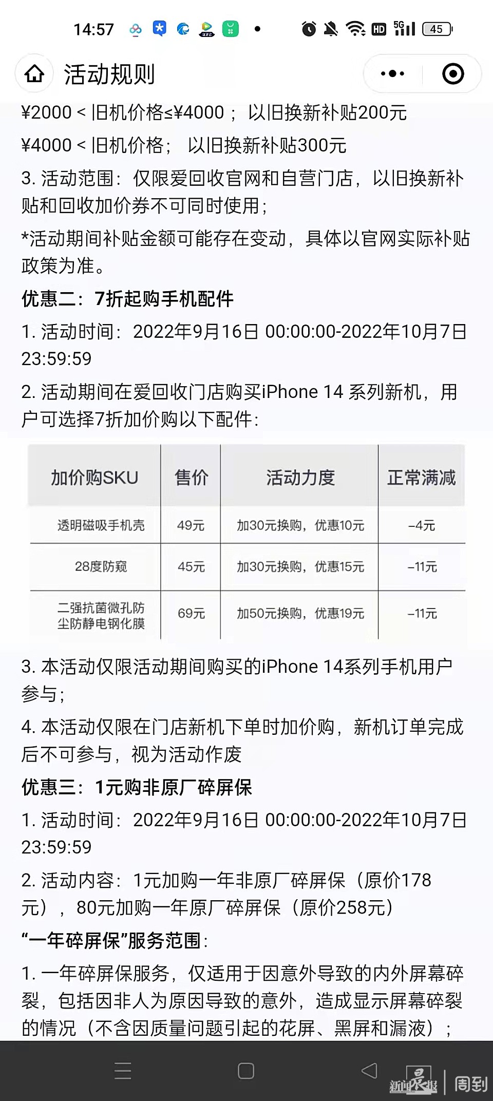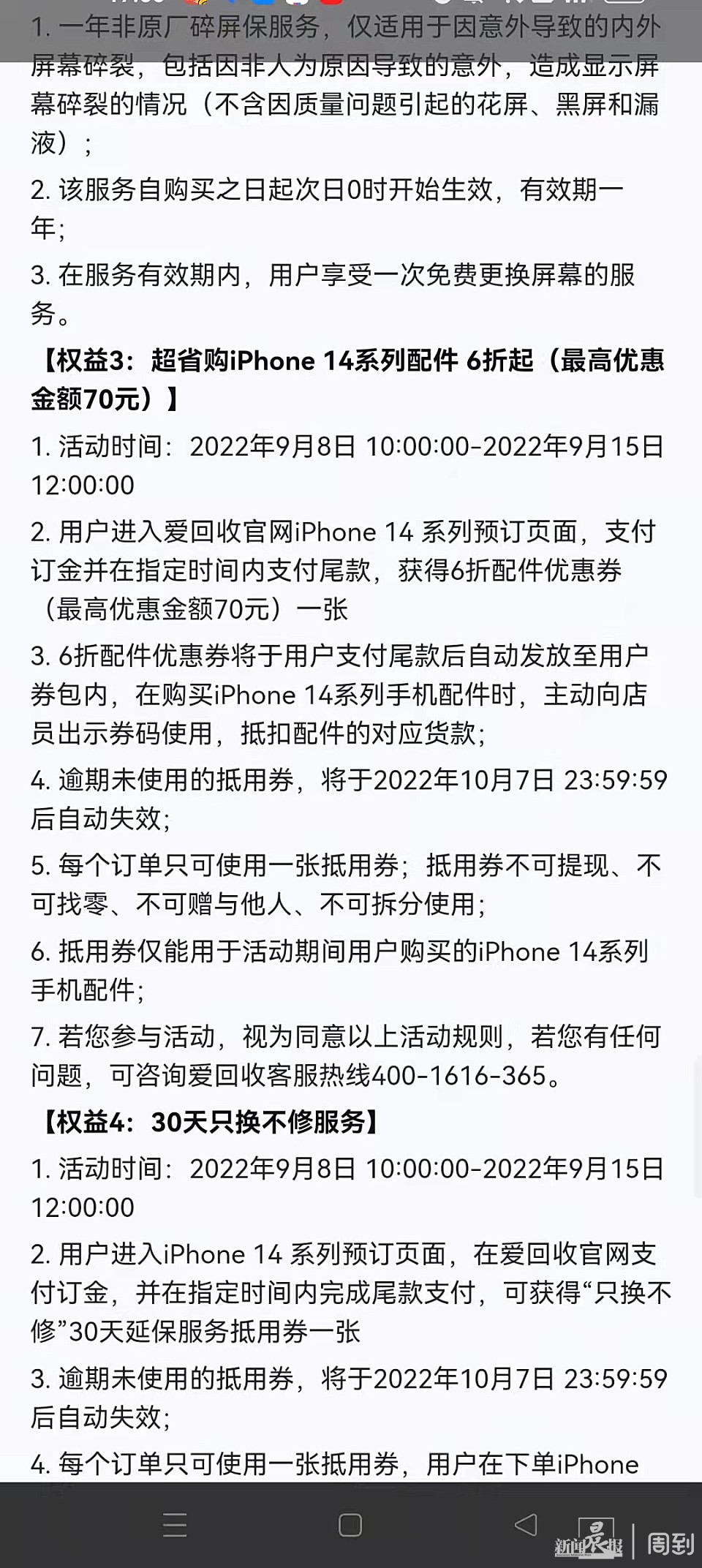 比如9月15日晚他们规则里还有一条权益是‘超省购iPhone 14系列配件6折起(最高优惠金额70元)’,而9月16日我再看,发现变成了‘7折起购手机配件’。”