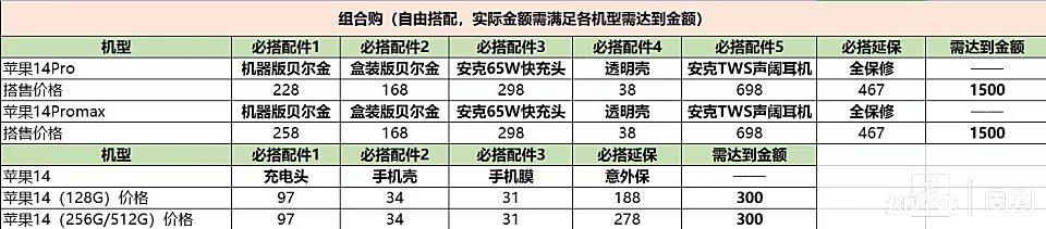 杨先生打开表格,发现如果要购买iPhone 14,则需要另外购买配件或延保产品,总价至少达到300元;若要购买iPhone 14 Pro和iPhone 14 Pro Max,更是需要搭配至少1500元的配件和延保产品。而可选的配件,均是其他品牌的快充头、手机壳、耳机等。而这些“搭售”商品的具体型号、商品图片,也均没有展示和说明。