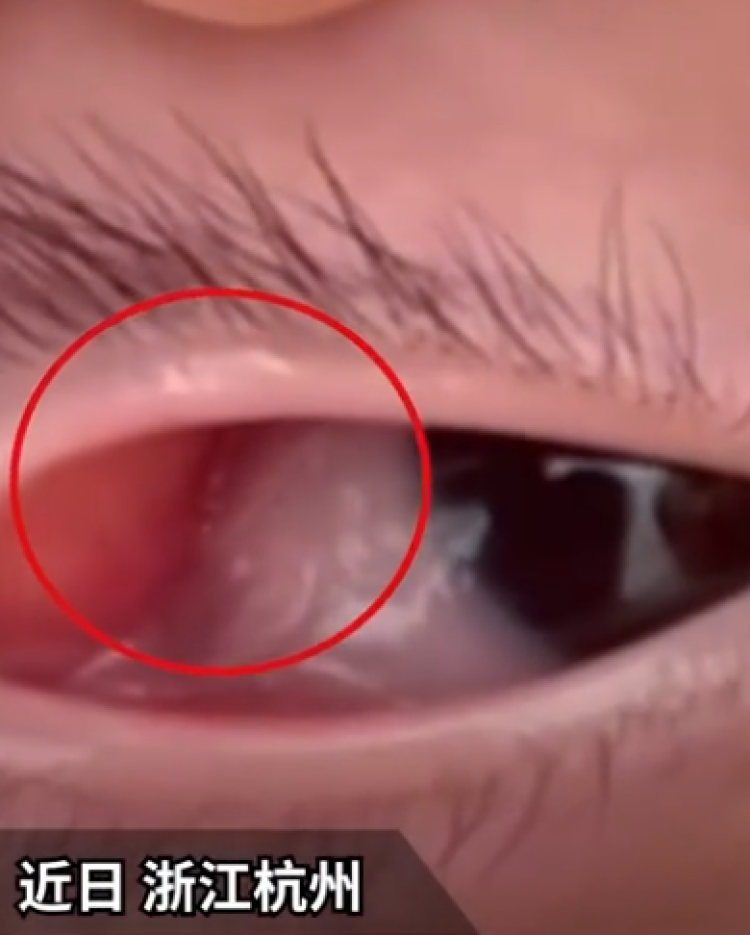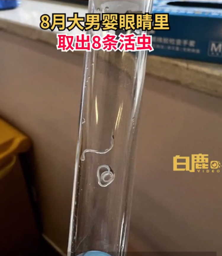 近日,浙江杭州一名8个月大男婴因出现揉眼情况引起父母注意,父母趁孩子熟睡扒开孩子右眼皮,看到有细细的白色虫子在蠕动!