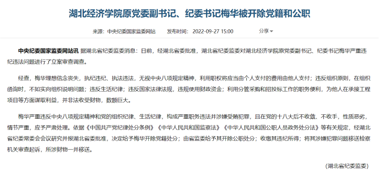 据中央纪委国家监委网站,湖北省纪委监委消息:日前,经湖北省委批准,湖北省纪委监委对湖北经济学院原党委副书记、纪委书记梅华严重违纪违法问题进行了立案审查调查。