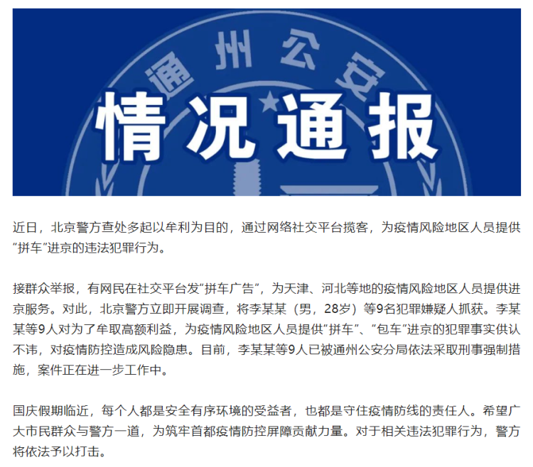 9月27日,据“通州警方在线”微信公众号消息,近日,北京警方查处多起以牟利为目的,通过网络社交平台揽客,为疫情风险地区人员提供“拼车”进京的违法犯罪行为。