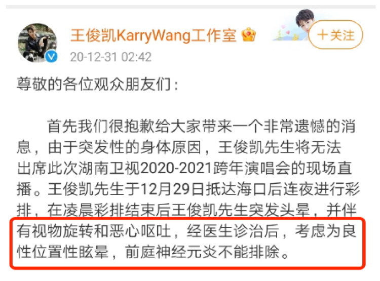 事实上,“耳石症”是一种较为常见的疾病。此前,艺人王俊凯也曾经因为连夜彩排突发头晕,后确诊为良性位置性眩晕(在医学上又称为耳石症)↓