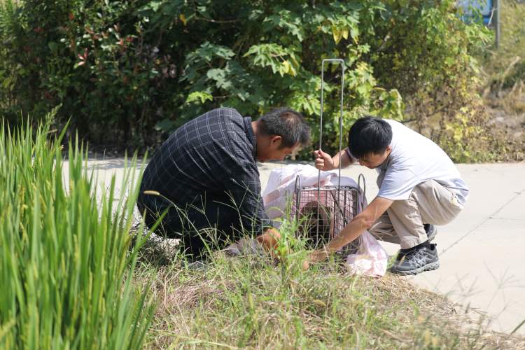 从动物园驱车来到嘉定发现地之后,市野生动植物保护事务中心、复旦大学研究团队、山水自然保护中心和嘉定林业站的工作人员共同见证了狗獾放归大自然。市民陆先生和市野生动植物保护事务中心工作人员郑运祥一起,打开笼舍,只见这只狗獾似乎也不急着回家,慢悠悠从笼子里走出来,回到农田。