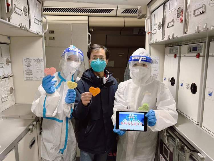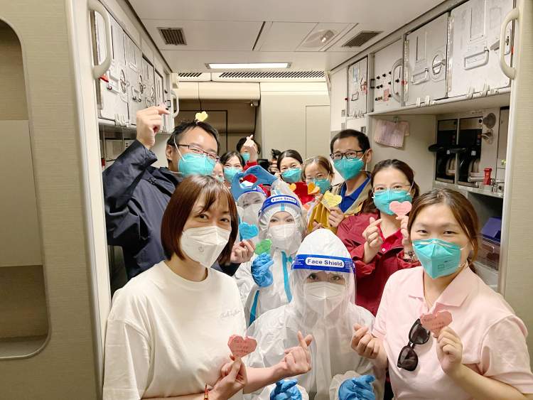 踏入“回家的飞机”客舱的那一刻,乘务组热情的问候、提前摆放好的预制餐食,让医护人员们一扫疲惫,顿时感受到了回家的温暖。乘务组亲手折叠了爱心折纸,手写了“英雄凯旋,欢迎回家”等字样的祝福寄语送给他们。