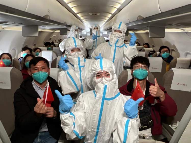 “白衣天使们,欢迎回家!西安欢迎你们!东航‘燕翔东方’党员示范飞行机组的全体成员向你们致敬……”