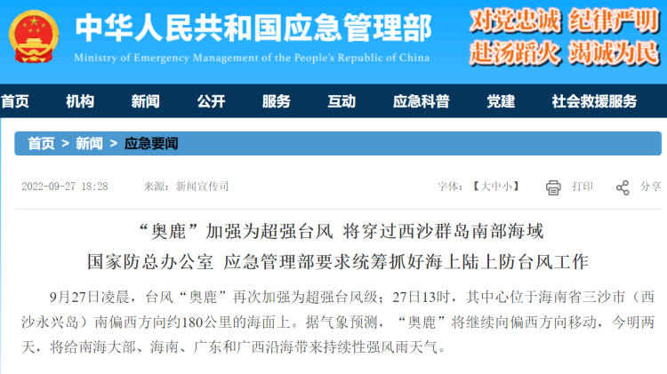 据应急管理部网站消息,9月27日凌晨,台风“奥鹿”再次加强为超强台风级;27日13时,其中心位于海南省三沙市(西沙永兴岛)南偏西方向约180公里的海面上。据气象预测,“奥鹿”将继续向偏西方向移动,今明两天,将给南海大部、海南、广东和广西沿海带来持续性强风雨天气。