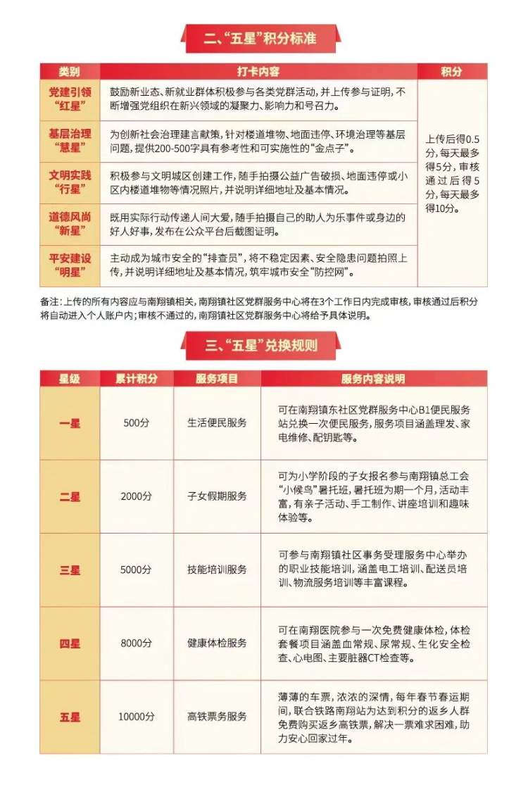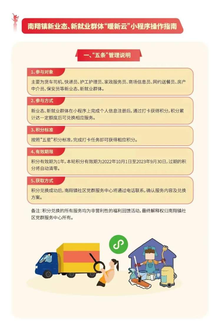 为切实提升新业态、新就业群体对党组织的认同感和归属感,依托“慧享聚”小程序,推出“暖新云”线上积分管理平台,现已上线测试,涵盖暖“新”驿站星光地图及“五星”积分兑换等服务,推进实施《南翔镇新业态、新就业群体“五星实践”积分制管理办法(试行)》,鼓励新业态、新就业群体发挥城市移动“啄木鸟”作用,以星星之火“燎动”基层治理活力。
