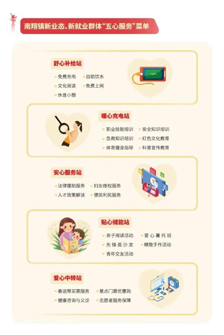 南翔镇党委立足新业态、新就业群体需求,整合各职能部门、区域化共建单位的资源力量,用舒心、暖心、安心、贴心和爱心服务护航新业态、新就业群体发展,推出“五心服务”菜单,在新业态、新就业群体工作“全链条”传递城市温度,让他们“新”心向党、“新”有所属。