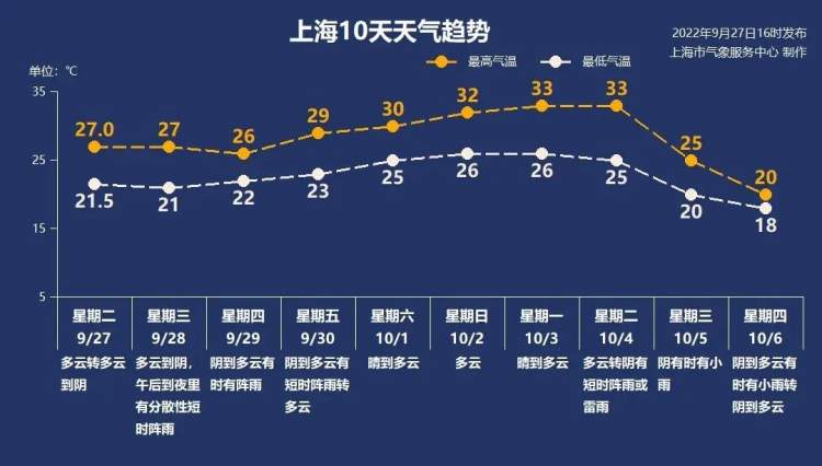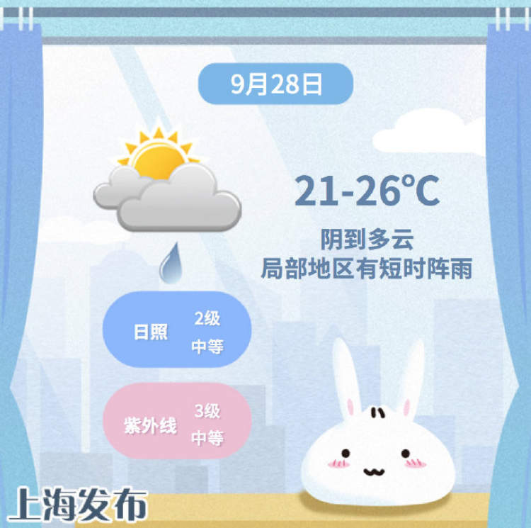 周五前申城都会有阵雨造访 早晚时分还要记得添衣保暖 周到君 2022-9-28 来源:周到上海 申城今日阴到多云,局部地区有短时阵雨,东到东北风3-4级。最高气温26℃,最低气温21℃,早晚时分记得添衣保暖。 预计周五前申城都会有阵雨造访,大家出行时最好备上雨伞~ 十一前期晴热为主,气温将步步攀升至33℃,10月4日后期冷空气来袭,气温急刹车,10月6日最高气温直跌至20℃。 来源:周到上海 作者:周到君 赞一个 (0)
