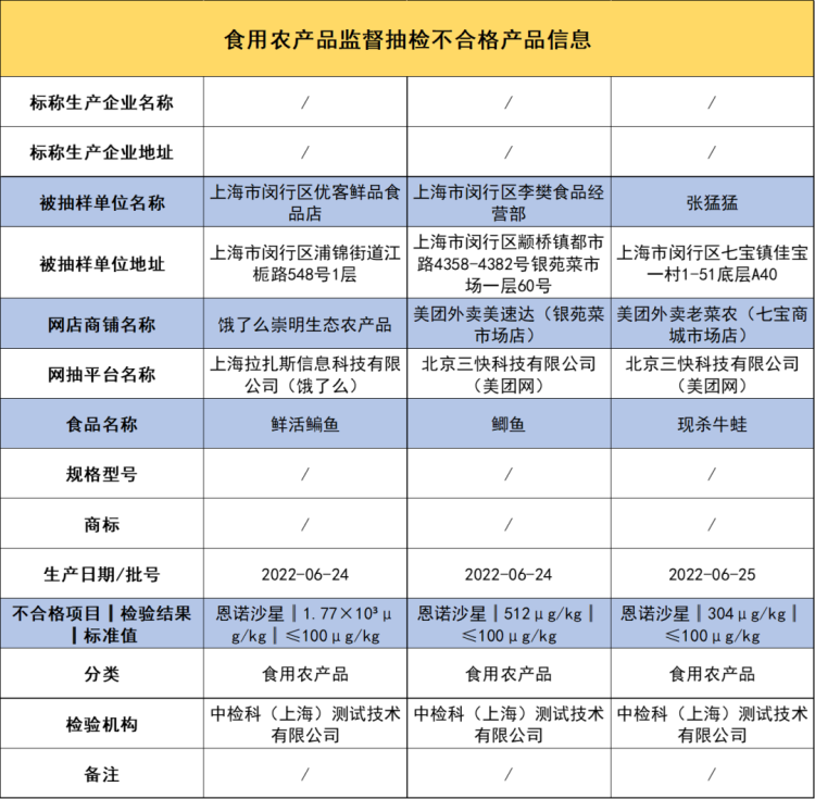 不合格样品为:饿了么崇明生态农产品(经营者为上海市闵行区优客鲜品食品店)在网店销售的鲜活鳊鱼(不合格项目:恩诺沙星)。