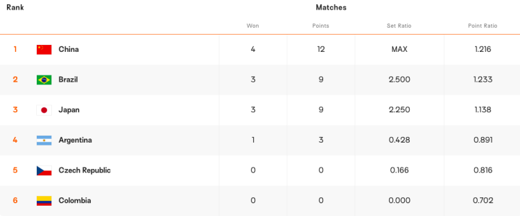 截止到目前,中国女排以四战全胜、连赢12局的战绩,位居小组首位。巴西女排和日本女排分别以三胜一负的战绩位居第二、三位。