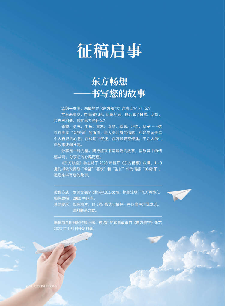 机会这就来了!东航杂志计划在明年推出《东方畅想》栏目并开放投稿,1至3月刊拟定“希望”“喜欢”和“生长”为关键词,邀请投稿者撰写2000字以内的文章,分享自己的故事。
