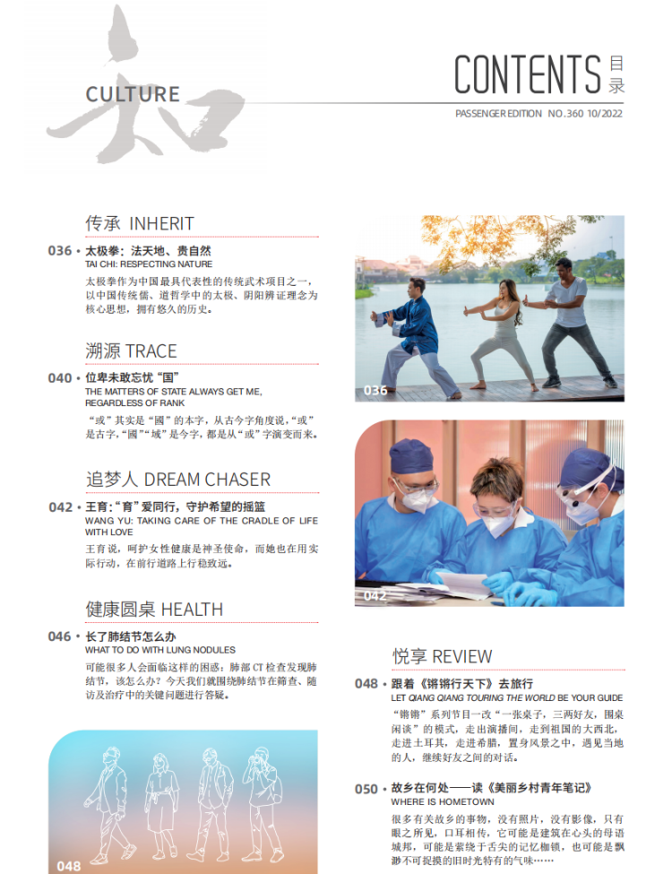 如今人们在忙碌的城市生活中时常会感到压力,身体也积累了不少隐患。本期东航杂志聚焦了肺结节、妇科肿瘤等健康议题,还介绍了公园里最常见的健身项目——太极拳。