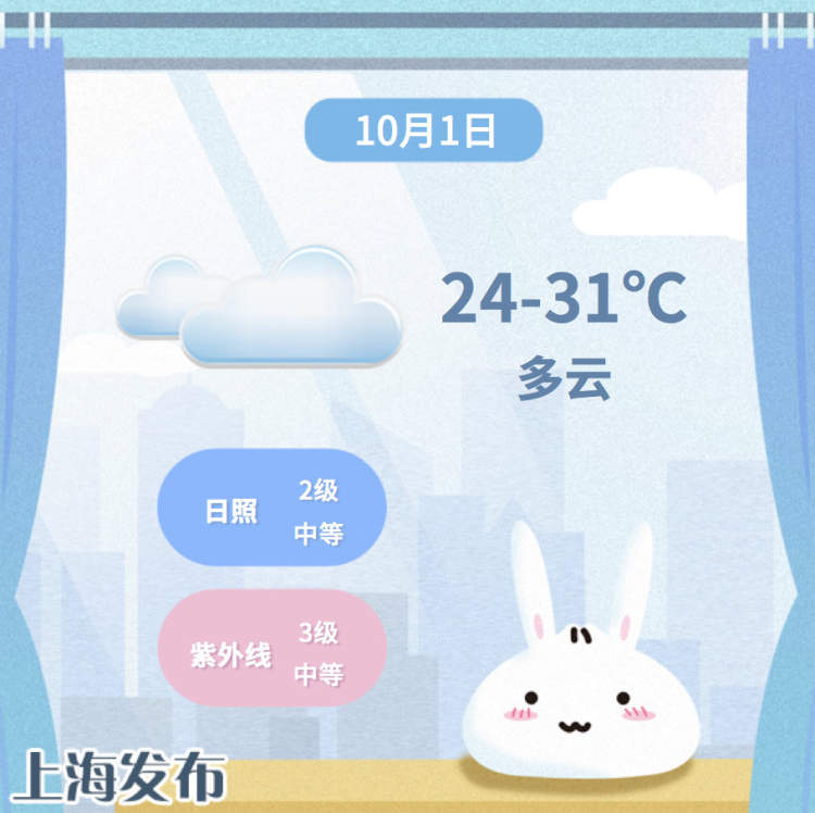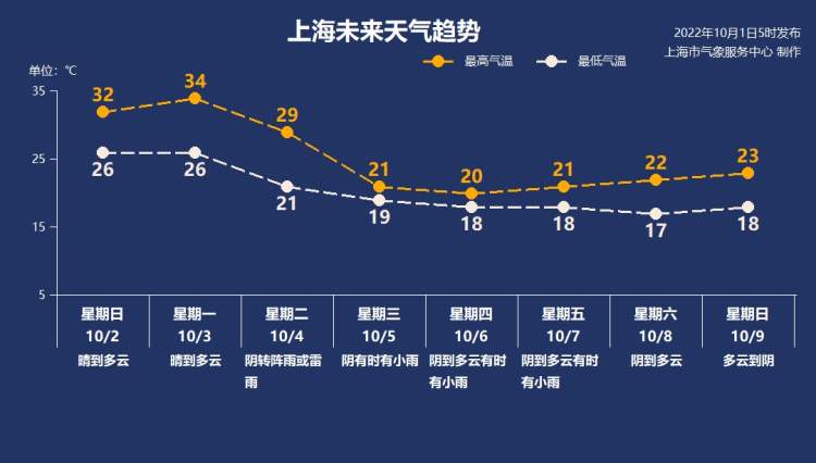 国庆假期气温先升后降!上海今日最高气温31℃,4日起大幅降温 周到君 2022-10-01 来源:周到上海 今天是10月1日国庆节,申城今天天气较为舒适,全天以多云为主,最高气温小幅回升至31℃,最低气温24℃,东南风3-4级,下午起4-5级。 明后两天受副热带高压控制,天气晴好气温飙升,预计3日最高气温可达34℃,算是十分热了,大家出门防晒措施还得做好。 4日起,受强冷空气影响,申城有一次降水和大风降温过程。其中4日降水比较明显,并可能会伴有雷电过程;5~7日以阴有时有小雨天气为主,气温下降明显。小长假后期最高气温将跌至20℃附近,一周过两季的感觉。 来源:周到上海 作者:周到君 赞一个 (0)