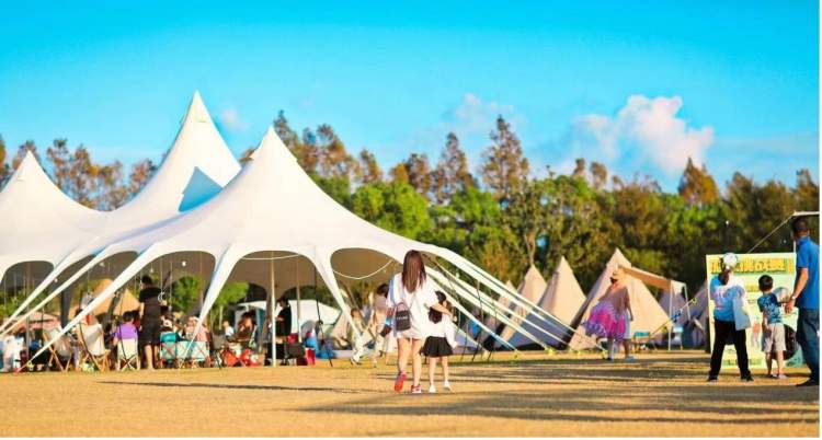 假期里,游客也可以租赁帐篷露营,有乐队互动演出。
