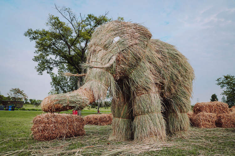 华东区系园大草坪上,用丰收后稻谷的秸秆作为元素,通过捆绑和重构来再现田园农耕文化,造型以小动物为原型,通过夸张的手法和适当的比例扩大,配上粮仓、草垛、摇绳机、脱粒机等农具,让都市游客也能感受浓浓的田园生活气息。