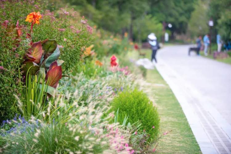 北美植物区,混色的醉蝶花与金黄色的向日葵交相辉映,形成自然而又壮丽的大地景观。周围禾草园和旱溪中的粉黛乱子草、荻花丛、各色观赏草、菊科花卉等组成混合花甸,形成2万余平方米的秋季缤纷花海。