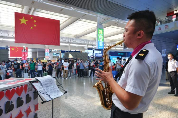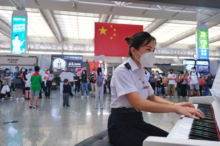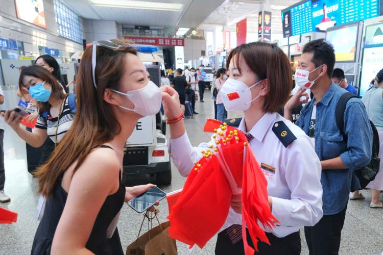 记者从中国铁路上海局集团有限公司获悉,今天,铁路上海站(下辖上海站、上海南站、上海虹桥站、上海西站、南翔北站、安亭北站、安亭西站)迎来国庆运输客流最高峰,预计当日发送旅客50.7万人。在虹桥火车站,铁路工作人员弹钢琴、吹萨克斯,向旅客发放五星红旗,为旅客口罩上贴五星红旗贴纸。