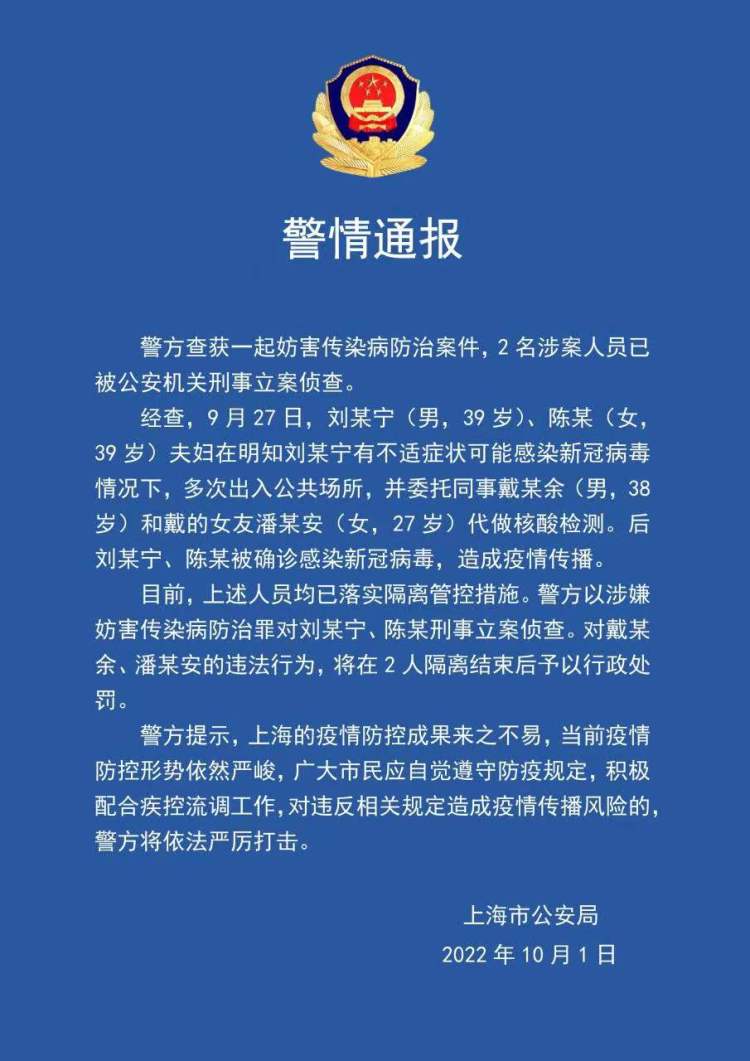 经查,9月27日,刘某宁(男,39岁)、陈某(女,39岁)夫妇在明知刘某宁有不适症状可能感染新冠病毒情况下,多次出入公共场所,并委托同事戴某余(男,38岁)和戴的女友潘某安(女,27岁)代做核酸检测。后刘某宁、陈某被确诊感染新冠病毒,造成疫情传播。