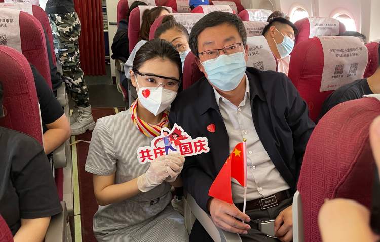 其中一位拥有34年党龄的旅客感慨道:“能在这个特殊的日子里,从万米高空俯望祖国的大好河山,让我觉得意义非凡,感谢金鹏航空用心的准备与贴心服务,祝愿我们伟大的祖国繁荣昌盛,也祝愿金鹏航空越飞越高。”