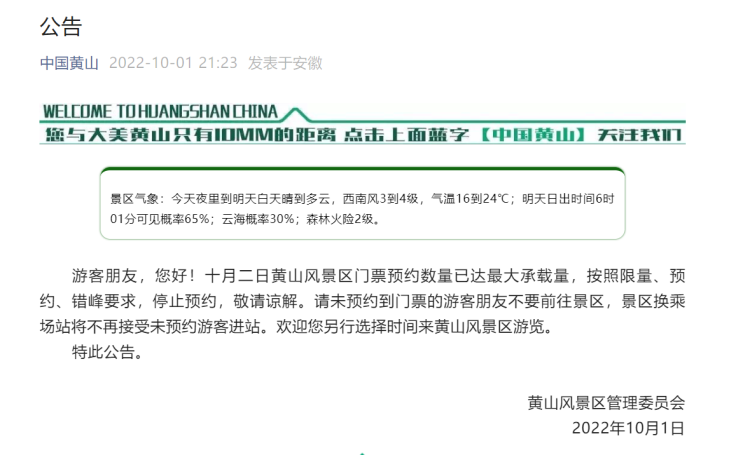 黄山风景区昨晚发布公告,10月2日门票停止预约 周到君 2022-10-02 来源:周到上海 “中国黄山”微信公号10月1日晚发布公告:十月二日黄山风景区门票预约数量已达最大承载量,按照限量、预约、错峰要求,停止预约,敬请谅解。请未预约到门票的游客朋友不要前往景区,景区换乘场站将不再接受未预约游客进站。欢迎您另行选择时间来黄山风景区游览。 来源:周到上海 作者:周到君 赞一个 (0)