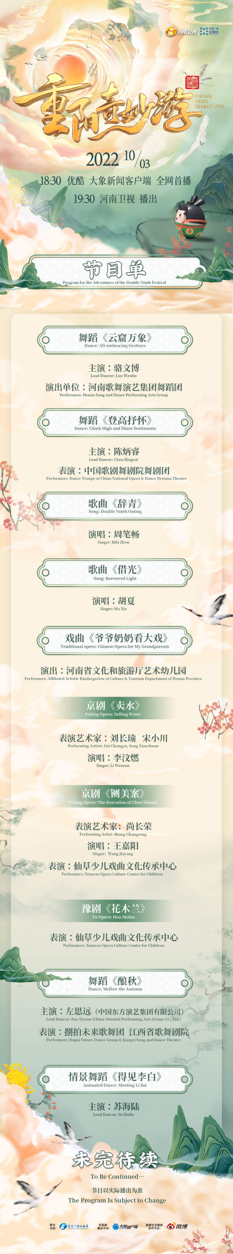 九月初九重阳节,2022“中国节日”系列收官之作《重阳奇妙游》也将在这秋高气爽之时到来。这档由河南广播电视台、优酷联合出品,河南台全媒体营销策划中心制作的特别节目,将于10月3日18:30 优酷、大象新闻客户端全网首播,19:30河南卫视大屏端播出。节目延续“中国节日”系列的表达方式,提取极具重阳节文化符号的元素进行艺术加工,通过古今与虚实相交、叙事与抒情相融表现手法,带领观众走入秋日山高水长的广阔画卷,感受重阳独有的醇厚情感。