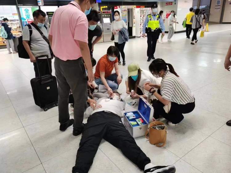 没有片刻犹豫,凌印申快速作出反应:“立刻广播寻找医护人员”、“拨打120”、“把医药箱拿来”、“有没有同行家属?看下他手机里能找到联系方式吗?”。同时,他与民警周奇立刻投入救援,用消毒纸巾擦去其嘴角污物,解开衬衫领口及领带,缓解其呼吸困难。