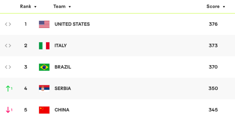 此外,昨晚战胜中国队的巴西女排凭借此役胜利,积分涨至370分,暂居世界第三位。