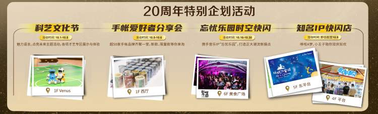 以潮流IP及品牌口碑流量注入线下场景,激发商业活力。10月1日-10月5日科艺文化节:正大广场1F Venus将为孩子们造梦空间,邀请小朋友们用梦想点亮未来。届时,朗诵、演讲、唱歌、相声等表演、面塑“药膳与保健”小制作展轮番呈现,小朋友们一起打开五感,遇见欢乐时光。10月5日-10月6日手账爱好者分享会:超50家手帐品牌齐聚一堂;