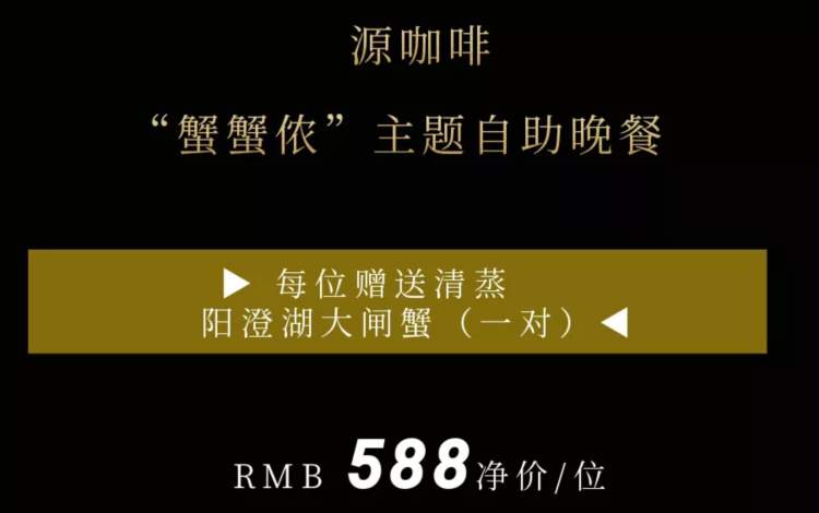 上海佘山世茂洲际酒店“蟹蟹侬”主题自助晚餐,588元/位,赠送一对清蒸阳澄湖大闸蟹,自助晚餐则不限量供应兰花蟹、老虎蟹、雪蟹脚等蟹菜。