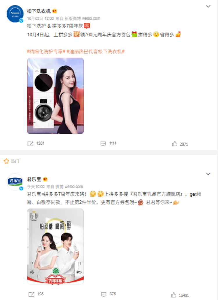 “今年假期大不同,掏出手机,拼多多海尔官方旗舰店把快乐送给你!#上拼多多 领700元周年庆官方券包#”,“#拼多多7周年庆#来袭!进入拼多多蒙牛旗舰店选取优惠商品下单!蒙牛全场好奶低至6折起,爆款牛奶至高限时直降69元!”10月4日,海尔、蒙牛等100余家品牌的官方微博纷纷为拼多多周年大促预热,组队为消费者送福利。