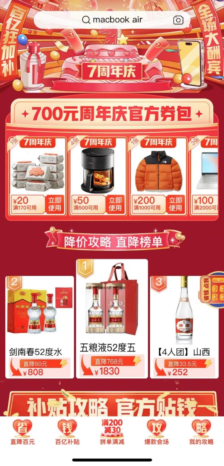 拼多多百亿补贴、万人团等频道资源将向大促活动全面倾斜。其中,Apple iPhone14所有机型全线补贴200元无门槛券,海尔洗烘套装、联想拯救者R9000P R7+3060灰、五粮液整箱52度普五浓香型等产品直接补贴近千元。消费者打开拼多多APP,通过首页“7周年”入口即可直达活动会场。