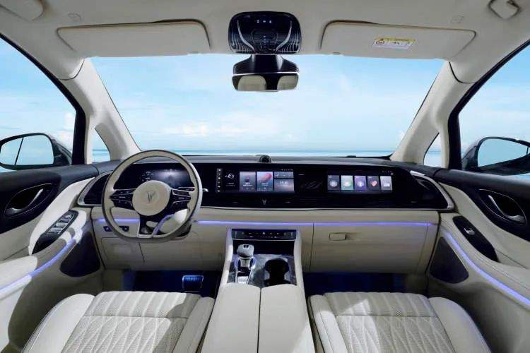 坐进车内,一眼望去甚至还有几分家的温馨气质。车内以浅色为主调,目光所及之处均采用皮质包裹,彰显奢华之风、典雅品位。与岚图FREE相似,梦想家采用三块12.3英寸液晶屏组成的1.4米无界贯通式三联屏,直接将中控台占满了,启动后视觉效果极为震撼。
