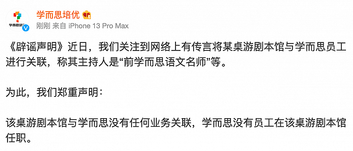 学而思辟谣:与某桌游剧本馆没有任何业务关联,没有员工在该桌游剧本馆任职 周到君 2022-10-10 来源:周到上海 10月10日,@学而思培优 官方微博发布声明称,近日,关注到网络上有传言将某桌游剧本馆与学而思员工进行关联,称其主持人是“前学而思语文名师”等。为此,公司郑重声明:该桌游剧本馆与学而思没有任何业务关联,学而思没有员工在该桌游剧本馆任职。 △此前网传截图 来源:周到上海 作者:周到君 赞一个 (0)